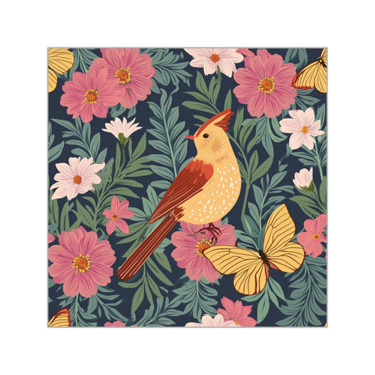 Bird with Butterfly and Flowers Square Vinyl Sticker
